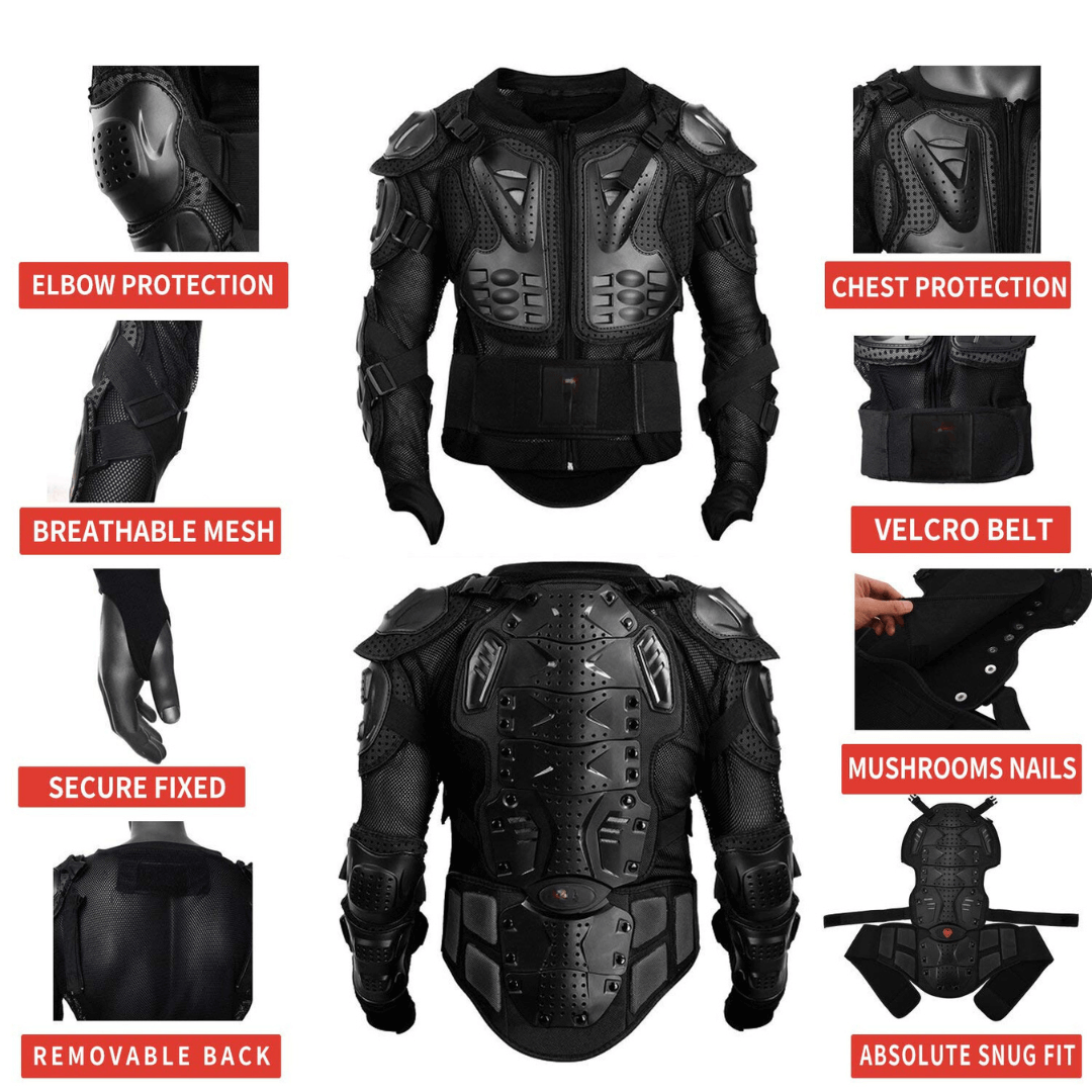 Crafted from high-density PE plastic and EVA, this jacket offers robust protection for critical areas like the chest, back, shoulders, and arms.